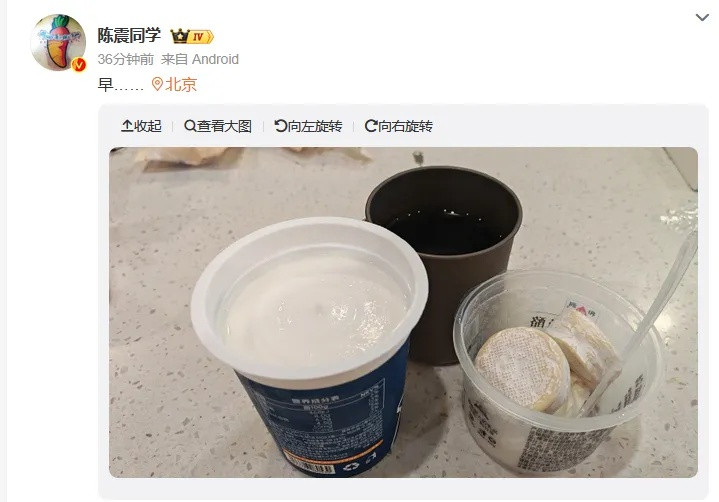 10月4日早上8时34分,陈震发微博“早……”并配图早餐图片,但未就车祸事故发声。