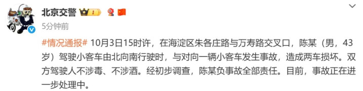 10月3日15时许,在海淀区朱各庄路与万寿路交叉口,陈某(男,43岁)驾驶小客车由北向南行驶时,与对向一辆小客车发生事故,造成两车损坏。双方驾驶人不涉毒、不涉酒。经初步调查,陈某负事故全部责任。目前,事故正在进一步处理中。