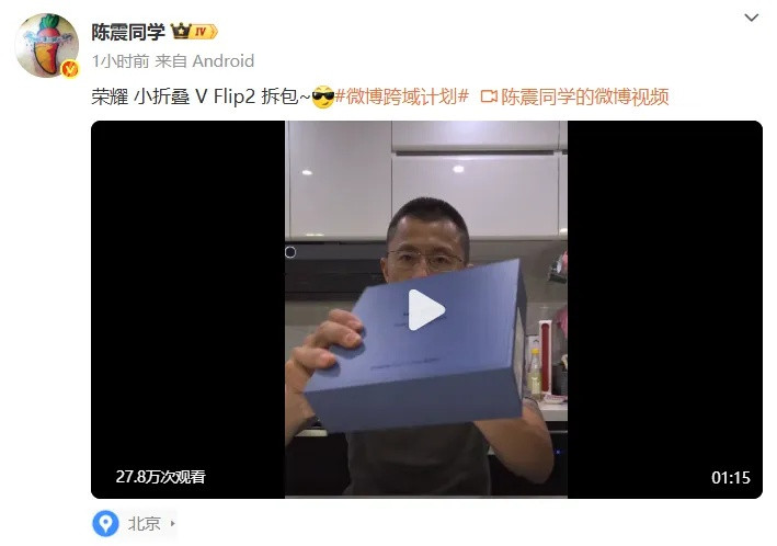 随后,9时18分,陈震又发了一条“荣耀小折叠VFlip2”拆包视频,仍未提及有关车祸的任何情况,网友纷纷在微博评论区请他回应车祸事故。